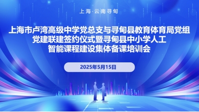 为进一步推动中小学人工智能教育,以人工智能引领构建以人为本的创新教育生态,培养学生科学兴趣和科学精神,提升数字素养与数字技能,2025年5月15日,上海市卢湾高级中学党总支与寻甸县教育体育局党组党建联建签约仪式暨寻甸县中小学人工智能课程建设集体备课培训会举办。寻甸县教体局、上海市卢湾高级中学分别设立会场。寻甸县委常委、副县长涂皘,县教体局班子成员、县教体局相关科室负责人,全县中小学信息技术骨干教师,以及卢湾高级中学党总支书记周雯婕、副校长吴建华、学校中层干部等出席活动。