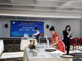 酒店服务赛场,仪态万方,专业规范。标准化的客房铺床、优雅精准的中西餐摆台,每一个细节都彰显出未来酒店人的职业素养与服务温度。