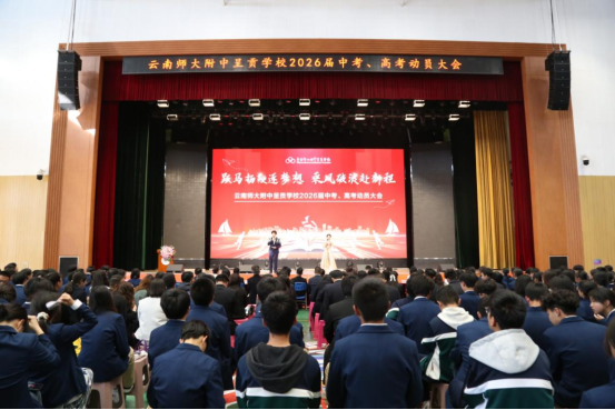 春和景明,万物新生。遥望盛夏,信心绽放。2026年3月20日,云南师大附中呈贡学校精心筹备并成功举办了以“跃马扬鞭逐梦想,乘风破浪赴新程”为主题的2026届中考、高考动员大会。出席大会的有特邀嘉宾矣进宏、云南师大附中党委书记王英、学校各级领导、年级主任,以及高三、初三年级全体师生和家长代表们。